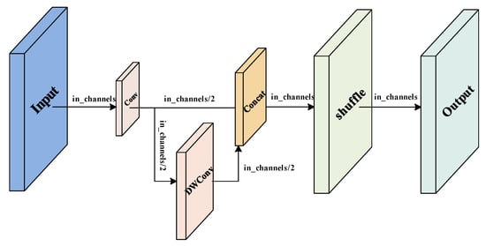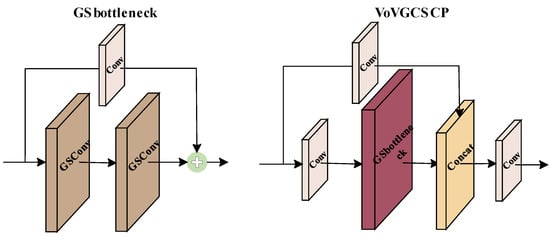 The GS-BiFPN structure is modified based on the Bi-FPN structure by replacing the original Conv module with GSconv and the C3 module with VoVGCSCP, which improves the feature fusion effect, speeds up the network inference, and effectively reduces the network complexity. The GSConv module is composed of a standard convolutional kernel, a depth-wise separable convolutional (DWConv) module, and a shuffle module []. The traditional DWConv module uses separate channels of convolution, which does significantly reduce the computational effort and the number of parameters, but also directly leads to the lack of feature information at the same spatial location during the convolution process and reduces the ability to extract features. In order to make up for this defect, the GSConv module combines the feature maps of the standard convolutional block and the DWConv module through the Concat operation and uses a shuffle strategy for the fused feature maps. The shuffle strategy mixes the feature information from the deep convolution module and the convolution module evenly, exchanges the feature information locally in such a way that the final feature map effect is as close as possible to the effect after standard convolution, and finally achieves a reduction in the number of parameters and FLOPs of the model while maintaining the accuracy. In addition, the VoVGCSCP module was designed based on the GSConv module, which reduces the complexity of the network. The structure of GSConv is shown in Figure 4, and the VoVGCSCP module is shown in Figure 5.