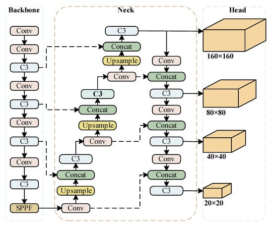 Faced with this challenge, the multi-scale feature fusion method can combine the feature information of a shallow network with the location information of a deep network to improve the detection ability []. The feature fusion structure of the feature pyramid network (FPN) [] adopted by the neck layer of YOLOv5 is one of the most popular multi-scale networks. Liu et al. [] proposed a multi-scale regional convolutional neural network to conduct multi-scale deconvolution post-sampling of deep convolutional features, splice them with shallow features, and finally construct new feature mappings. The Bi-FPN structure proposed by Tan et al. [] is an improved feature fusion method based on the FPN structure, which has been widely used since it was proposed. In the study of deep supervised convolutional neural networks, Qu et al. [] tried to introduce deep features into shallow features at different stages of convolution. Wang et al. [] proposed an AF-PAN structure to enhance feature extraction in feature fusion networks by introducing an adaptive attention module (AAM) and a feature enhancement module (FEM).