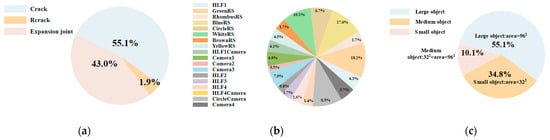 There were three types of targets in the road Crack dataset, namely Crack, Rcrack (Repaired crack), and Expansion Joint. The proportions are shown in Figure 8a. A total of 18 categories were marked in the traffic sign dataset, namely HLF1 (Path Gantry), HLF2 (Speed Gantry), HLF3 (Monitor Gantry), HLF4 (LED Guidance Screen Traffic Gantry), HLF1Camera (Path Gantry Camera), HLF4Camera (LED Guidance Screen Traffic Gantry Camera), GreenRS (Green Traffic Sign), BlueRS (Blue Traffic Sign), WhiteRS (White Traffic Sign), BrownRS (Brown Traffic Sign), YellowRS (Yellow Traffic Sign), Camera1 (SkyNet Surveillance Camera), Camera2 (Traffic Flow Monitoring Camera), Camera3 (Bayonet Camera), CircleCamera, and Camera4 (Violation Capture Camera). This basically covers the main traffic environment on expressways, in which small targets account for about 34.8% of the traffic sign dataset. The proportions of all types and targets of different sizes are shown in Figure 8b,c.
