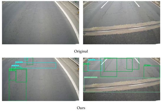 Early research on object detection is mostly based on image processing algorithms, which extract and classify objects according to their color, shape, edge, and other features []. Liu et al. [] proposed a binary classification method for concrete crack recognition based on crack features. However, the classification threshold of this method needs to be set in advance, which has certain limitations and cannot adapt to complex road crack scenarios. Wang et al. [] used the orthogonal projection method to define and evaluate the dataset and finally divided the crack image into three levels. The proposed method has a good detection effect and robustness. Noh et al. [] proposed an automatic crack detection and segmentation method for concrete images based on fuzzy C-means clustering and multiple noise reduction, which can effectively distinguish between background and cracks. However, when the crack location contains a lot of noise, the detection effect is not so successful. In the face of high-speed driving scenes, image noise is inevitable. At the same time, if the hardware performance is improved, the cost is too high, and this method is not suitable for real industrial scenarios. Although early image processing techniques can also help complete certain detection tasks, these methods can achieve good results under ideal conditions, but in the actual application of industrial scenes, compared with neural networks, they are still unsatisfactory.