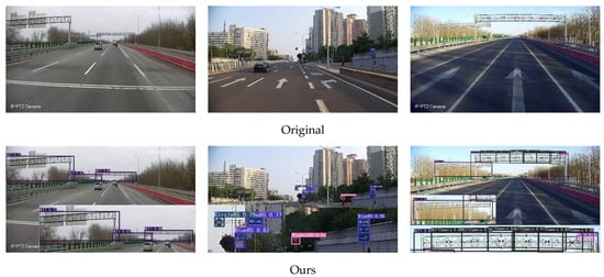 The same comparison experiment was carried out for traffic signs, and the same training technique was used for each model. The experimental results are shown in Table 6. Since road markings are far more complex than road cracks, the experiment is evaluated for small, medium, and large targets, where APS, APM, and APL are the mean values of mAP at different intersection ratio thresholds of IOU = 0.5:0.95. It can be seen from the table that the model in this study has good performance on small targets and large targets and is better than other mainstream models. The test power for medium-sized targets is only 0.4% lower than that of the TPH-YOLOv5 model. The number of parameters is basically the same as that of YOLOv5, and the number of FLOPS is slightly higher than that of YOLOv5. In the verification process, the method used in this study was able to achieve 52 FPS with a GPU. The overall performance shows that the improved model can be competent for low-cost industrial detection tasks. In the following experiments, the batch size was uniformly set to 16 and the epoch was uniformly set to 100.