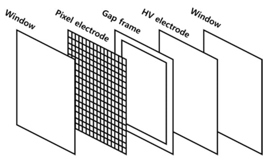 A beam monitoring system is a device for measuring the intensity and position of the cross-section of an irradiated ion beam. The system used in this study comprised a 2D-pixel detector and DAQ component. The 2D-pixel detector was layered from left to right with a window, pixel-type electrodes, a gap, high-voltage electrodes, and another window (Figure 1). There were 256 pixel-type electrodes in the system with a dimension of 4 mm × 4 mm; the pixel interval was 0.125 mm. The maximum level of measurement was 65 mm × 65 mm. The detector was designed to allow the space between pixel electrodes and high-voltage electrodes to be adjusted by 2–5 mm using an independently fabricated gap. The gap frame was produced using a 3D printer with PLA material, which is an insulator and has a melting point higher than 200 degrees. To adjust the gap, a gap frame with the desired thickness was manually inserted between the cathode electrode and high-voltage electrode. The maximum voltage bias was 2000 V (Table 1).