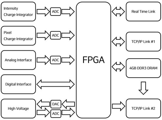The DAQ process comprised software programmed with Labview [] to enable the real-time monitoring of the beam and DAQ board, which received signals. The DAQ board was connected to the detector, which measured the beam current, position, and profile, to perform data collection and transmission. The current from the detector upon beam irradiation was measured using the charge integration method with an AFE0064 chip (Texas Instrument, Dallas, TX, USA) []. The measured values were converted using an analog-to-digital converter (ADC) and stored at a 40 μs frequency. Subsequently, the values were transmitted in real time to a PC connected via TCP/IP (Figure 2). The analog interface of the DAQ board was able to accept input signals in the range of 0 to +24 V and generate high voltages in the range of 0 to 2000 V based on the input value. The digital interface controlled the operation of the DAQ board during start and stop times. The FPGA was reprogrammable, allowing the current measurement settings to be customized depending on the type of beam measured. The measured beam data were stored in real time using 4 GB DDR3 DRAM. Using a PC, intensity values from each of the 256 pixels were visualized in real time using an independent software programmed with Labview. The beam position and dispersion was also checked in real time. For data extraction, the maximum recordable time per file was 1000 s and the gain value at measurement could be controlled at 0–7 to eliminate noise and collect amplified values for the target signals (Table 2).