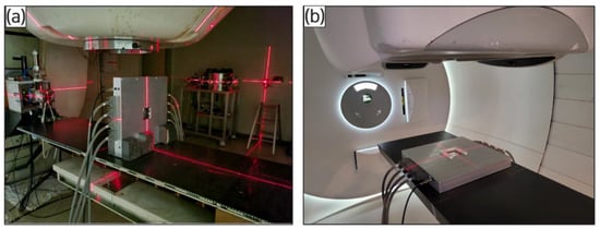 Photos of beam alignment at center of detector before experiment; (a) MC-50 cyclotron of Korea Institute of Radiological and Medical Sciences and (b) proton therapy machine of National Cancer Center. The distance between the beam source and detector was 100 cm.