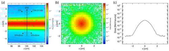 The results obtained from the PHITS simulation are presented in Figure 4. Figure 4a shows the irradiation of the proton beam at the pixel detector. The plots of the energy transferred to each pixel and ion pair generated at the gap were obtained to calculate the saturation charge at the detector, as shown in Figure 4b,c. To obtain the saturation charge value, the number of ion pairs obtained in each pixel from the simulation results was multiplied by the current value used in the experiment, and the collection efficiency was obtained by entering the d and V values into Equation (1).