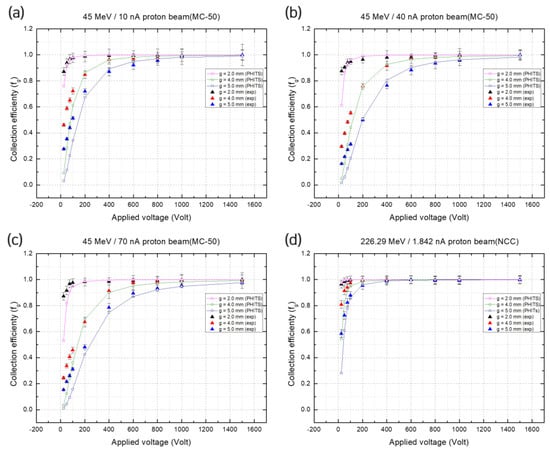 Figure 5 shows the collection efficiency values according to d and V, where the empty shape represents the results obtained from the PHITS simulation, and the filled shape represents the saturation charge value measured during the experiments. The saturation charge, calculated using Equation (1), was 3.34 × 10−7 C/s for a 2 mm gap, 10 nA current, and 45 MeV energy proton beam, which increased to 8.36 × 10−7 C/s as the gap increased to 5 mm, which was obtained from the PHITS simulation (Figure 5a). The obtained value from the PHITS simulation was 0.992 for a gap of 5 mm and voltage of 1500 V, which indicates a ~0.4% beam loss. The collection efficiency approached 1 as the voltage increased within the range of 0–1500 V in both the simulation and measurements. As the current increased to 40 and 70 nA for a 2 mm gap and 45 MeV energy beam, the saturation charge obtained from the PHITS simulation increased to 1.14 × 10−6 C and 1.87 × 10−6 C, respectively, and a 2–5% beam loss was observed as the gap increased to 4 and 5 mm, unless the voltage increased to ≥1000 V (Figure 5b,c). Figure 5d shows the values obtained from the experiment for a 226.29 MeV proton beam, used to determine the conditions that would not cause a loss in collection efficiency before the evaluation of positional accuracy. Because the current for the NCC proton beam was low, the beam loss was ≤0.5% at 500 V for 2, 4, and 5 mm gaps. For a voltage of 1000 V and gap of 2 mm, the beam loss was below 0.1% for all the simulation and experimental values.