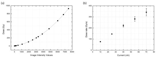 The signals received by the DAQ were the intensity values. The film calibration curve was drawn to convert these measured beam values to dose values, which were used to determine the proton beam dose across varying conditions (Figure 6a). The results indicate that the UHDR beam output for a 45-MeV energy proton beam was 76–77, 142–149, 209–233, 260–303, and 309–375 Gy/s with applied currents of 10, 25, 40, 55, and 70 nA, respectively (Figure 6b).