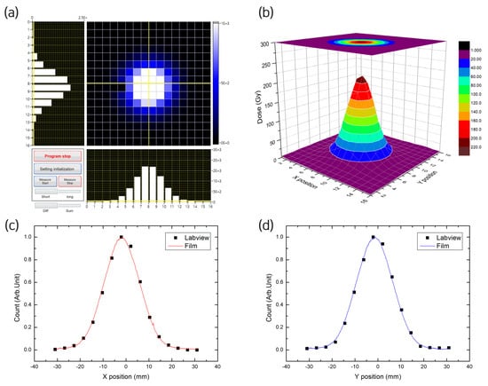 MC-50 cyclotron beam profiling. (a) Real-time detection of the beam shape on the Labview software; (b) visualization of the dose calculated based on film irradiation; (c) Labview and film beam profiling at Position X; and (d) Labview and film beam profiling at Position Y.