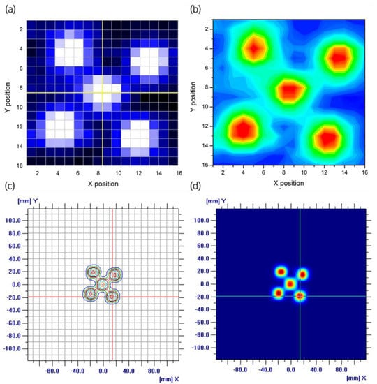 Table 3 presents the calculated values of the position at five reference points of beam irradiation based on the intensity values received by each of the 256 pixels at the pixel detector as well as the measured values from the Matrixx. The reference point with the largest deviation from the measured value at the pixel detector was (19,15) with σx = 0.5 mm and σy = 0.7 mm. For the center point (0,0), the deviation was ≤0.1 mm. The error range for the measurements taken using the Matrixx at the five reference points was 0.1–1.6 mm, indicating a larger deviation than that of the pixel detector.