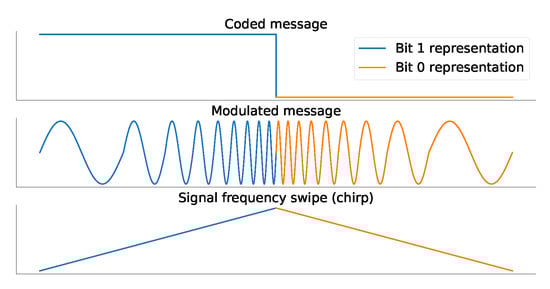 LoRa has a digital modulation scheme based on the CSS spectral spreading technique to transmit messages, giving high communication rates for range, and reducing power consumption. LoRa modulation is resistant to Doppler and multi-path effects. It consists of 0- and 1-bit representations as linear variations of frequencies. Figure 2 illustrates an example of LoRa 0- and 1-bit representation, the corresponding symbol for each bit, and a representation of the frequency variation of the symbol. The frequency shift rate is controlled by the Spreading Factor (SF) parameter, where higher values mean better signal immunity against noise.