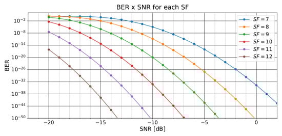 Finally, Figure 3 illustrates the relationships between BER and SNR for a LoRa modulation on an AWGN channel considering different SF values. We can observe that a higher SNR of a signal provides a lower BER. Additionally, considering the same SNR value, higher SF values performed better on communication.
