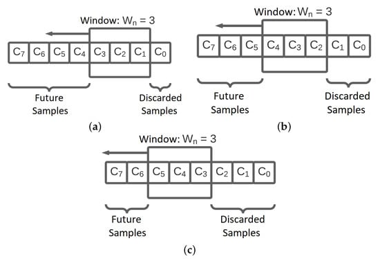 The process described above is detailed in Figure 4. Figure 4a presents the first step of the sliding window parameter change solution. The samples , , and are added to the sliding window, the sample , which is part of the window, is discarded, and other samples will be collected (future samples). In practice, they were not recorded on the system memory yet. In the second step, illustrated in Figure 4b, a newer sample arrives at the micro-controller and the window is moved to the left, writing this sample in the data set and discarding the sample . Then, this process repeats in the third step as shown in Figure 4c.