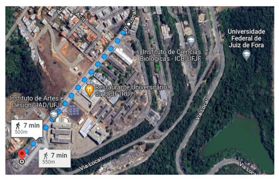 During the development of this work, we deployed a small LoRa network. The network illustrated in Figure 5 comprises one primary node together with other nodes, and they form a graph with a star topology. We developed two algorithms for operating the primary (gateway) and secondary devices. Figure 6 shows the scenario under our university campus where the test was deployed. The distance between the nodes was nearly 500–700 m.