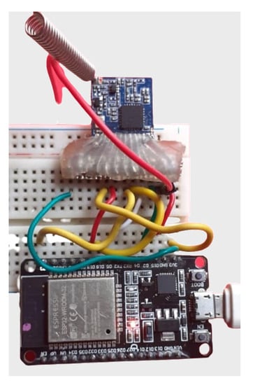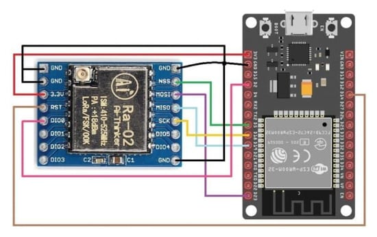 As mentioned, a testbed was created to conduct the evaluation. It is composed of LoRa nodes client/gateway prototypes and a mobile application to configure the nodes, responsible for running the experiments and collecting the measures. Figure 7 and Figure 8 show the client and gateway node connections with details.