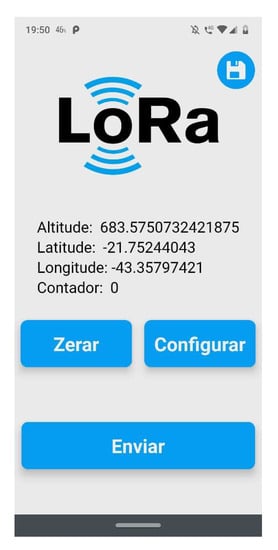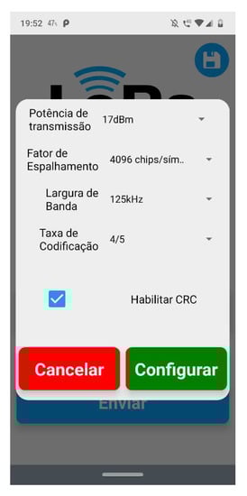 To collect data from our experiments, a mobile app was built. This solution was responsible for connecting to LoRa nodes and sending and receiving data about settings and measures. Figure 9 and Figure 10 show the main screen about sending configuration settings to the nodes. To connect to the nodes, a Wi-Fi interface from ESP32 was used.