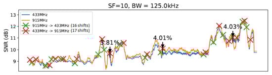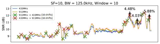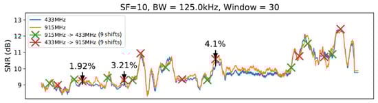 The window with was represented by the InstantChange technique. From the analysis of the results, we concluded that the larger sliding window does not always mean a higher SNR gain. We identified the most efficient setups have between 0 and 30 units of length. The sliding window of 20 units of length could be considered the one with the best efficiency ratio since it achieved a considerable reduction in the carrier frequency changes and still had an SNR gain. Considering the LR-ADR, we would like to highlight that the proposed technique by [] was created to be applied in a LoRa network with more than one gateway. Once it is not our scenario, the LR-ADR was evaluated, keeping the parameters (i.e., SF, BW, Frequency) values or shifting to another one. This particularity of our evaluation and proposal objectives could have influenced the LR-ADR performance’s final result.