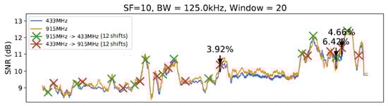 The hypothesis that the sliding window always reduces the number of frequency changes was tested as true only for the windows of 20, 30, and 40 units of length, as the window of 10 units scored a higher number of changes. Nevertheless, the hypothesis that a sliding window for the moving average of SNR as an input to the decision-making regarding LoRa’s carrier frequency changes was partially confirmed, because longer window lengths reduced the gain instead of increasing it. Therefore, the proposed technique demonstrated that for a desired window length range there was an increase compared with the windowless technique. Those improvements represent advancements in LoRa’s communication quality, as highlighted in Figure 3 that shows the relation between a decreasing BER and an increasing signal’s SNR value. Moreover, the sliding window technique was better than the windowless technique, noting that those better results, depending on the window length and parameter, are being taken into consideration (number of changes or SNR gain), whichever is more important for some appliances or others.