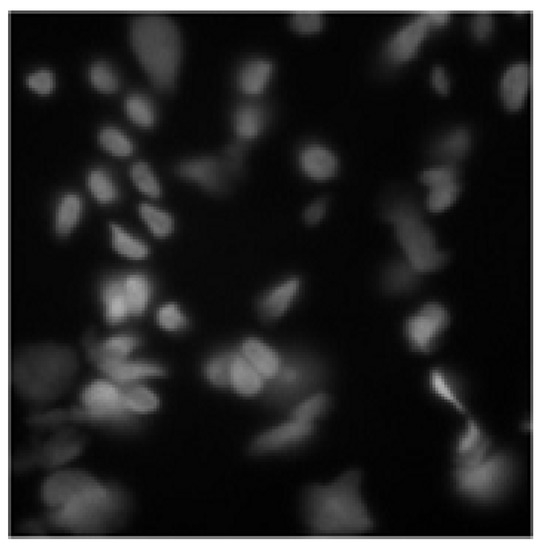 The second dataset was introduced in [69] and then used in [67]. It is composed of 61 RGB images with a resolution variable of approximately cancer cells/nuclei taken from the Huh7 and HepG2 regions. Koyuncu et al. acquired images under a Zeiss Axioscope fluorescent microscope with a Carl Zeiss AxioCam MRm monochrome camera with a 20× Carl Zeiss objective lens. For the Hoechst 33258 fluorescent dye, a bisbenzimide DNA intercalator can be observed in the blue region upon UV region excitation. Hoechst 33258 dye was excited at 365 nm and the blue light (420 nm) emitted was acquired [69]. Therefore, the bright color in this dataset was not white but blue. Therefore, this dataset was preprocessed to extract the blue channel of the image, to obtain a grayscale image representative of fluorescence. This dataset was not used to train the model, because it did not include a variety of neuroblastoma datasets. However, it was used as a test set to examine the generalization capacity of the algorithms.