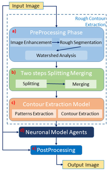The first phase is the preprocessing (see Figure 2a), in which a rough contour is evaluated. Thus, the image is enhanced, and a first rough segmentation is performed. Specifically, the grayscale image is sharpened through a convolution process [54,81] with this kernel: