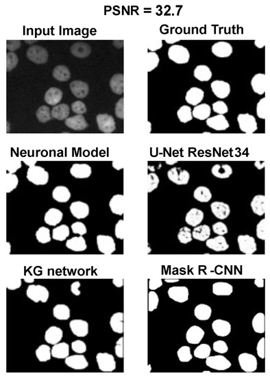 A keypoint graph network (from now on KG Network) is a neural network based on the concept of the keypoint graph [51]. The network first applies ResNet34-based feature extraction. Then, the network layers identify some points (called keypoints) that discretize the input image, and the collected keypoints are processed to extract the bounding boxes of the cells/nuclei. Finally, the bounding boxes of the cells/nuclei are taken as the input for the final layers, which extract the cell/nuclei masks. This network (in contrast with the previous U-Net) provides object-by-object segmentation. However, it has a more considerable forward time than U-Net and had a training time of approximately 4 h on the same machine with a GPU RTX 2070 with 8 GB of VRAM. In this study, we used a PyTorch implementation publicly available at the website https://github.com/yijingru/KG_Instance_Segmentation (accessed on 10 January 2022) based on Ref. [51], with grayscale images at a resolution of .