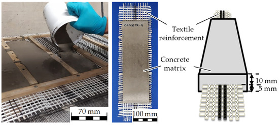 In total, 90 samples of textile reinforcement were placed into molds of the size 340 mm × 100 mm × 15 mm that were coated with release agent (RECKLI Stripping Wax TL). The standard concrete recipe developed in subproject C1 from the Collaborative Research Centre 532 was used for concreting (Table 5) [39,40].