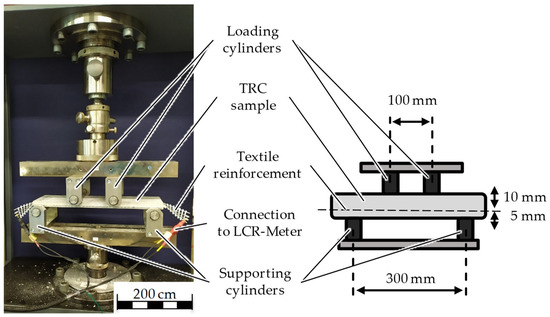 The loading cylinders have a distance of 100 mm from each other and remain fixed during the test. The supporting cylinders, on the other hand, have a distance of 300 mm from each other and can move upwards according to the test settings. The test speed is set to 1.8 mm per minute. The TRC sample is oriented and mounted in the apparatus in such a way that the distance between reinforcement and supporting cylinders is 5 mm. Both ends of one carbon roving of the textile reinforcement are connected to the LCR-Meter Wayne Kerr 43,200 to observe the change in the electrical impedance.