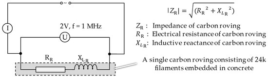 DC-based electrical measurements are commonly used in the literature to detect the mechanical strain or damage in a concrete structure by using carbon rovings as sensors [10,21,23,25,26,28,29,30,31]. Recent investigations recommend AC-based electrical measurements to sense the mechanical strain and damage in the composite structure. The reason is explained by the fact that a single carbon roving, which consists of thousands of filaments, cannot be described as an ideal resistor or an ideal inductor. For a proper characterization of this sensory mechanism, other electrical properties, in addition to the electrical resistance, must be examined, and this is feasible by using AC-based electrical measurements. Uncoated carbon rovings embedded in a concrete matrix have a unique micro-structural mechanism on the basis of abovementioned behavior of outer and inner filaments. A resistor and an inductor serially connected to each other represent a single uncoated carbon roving [32].