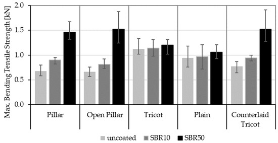 In the case of uncoated textile reinforcement, the rovings with a flat cross-sectional shape (Tricot and Plain binding) lead to a higher bending tensile strength than other ones. This is followed by the elliptical cross-sectional shape of the Counterlaid Tricot. Although it does not appear to have a strength as high as the flat cross-sectional shape, it performs better than the circular cross-sectional shapes of the Pillar and Open Pillar.