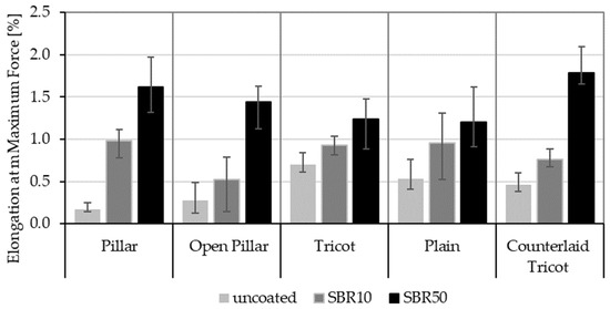 Moreover, the maximum elongation percentages of the TRC samples are measured under the applied force to compare the ductility of the samples. Figure 5 shows the elongation of all TRC samples at maximum force.
