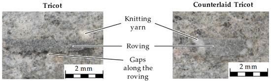 As shown in Table 3, different binding types of textiles lead to different roving shapes [12,27,28,31]. Pillar and Open Pillar bindings lead to a circular roving cross-section, while Plain and Tricot bindings result in a flat roving cross-section. Counterlaid Tricot, on the other hand, leads to an elliptical cross-section of roving.