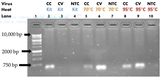 | Cell Culture/ Cultured Viral Solution/ dH2O (NTC) | Nucleoprotein (601 bp) | 70 °C/ 20 min 10 µL or 95 °C/ 10 min 10 µL or No heat 10 µL |
