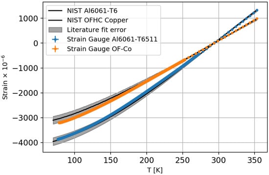 To test the strain gauge calibration, the thermal strains of Aluminium-6061-T6511 and oxygen-free copper were measured, as their thermomechanical behaviour is known from the NIST database [,]. The measurements were carried out for each sample with a strain gauge and a Pt1000 using the same procedure as for the calibration.
