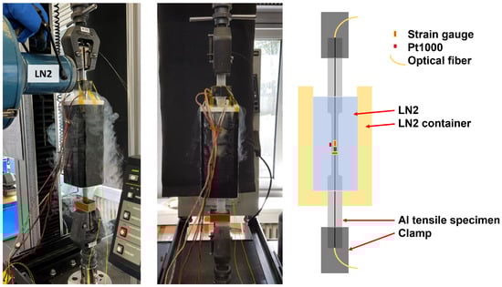 A liquid nitrogen container was placed around the central area of the strain gauge, enclosing the central 30.0 cm of the specimen. This allowed the strain specimen to be clamped into the tensile test machine and the central area to be cooled with liquid nitrogen. Figure 4 shows the tensile specimen and the tensile test setup. The tensile test machine has an integrated distance meter and load cell (30 kN), which was read out together with the Pt1000 and strain gauges with a Keithley 2701 multimeter with a measurement range of 120 MΩ and a resolution of 1 mΩ.