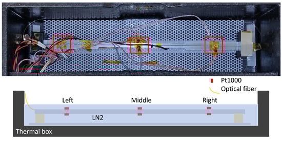 Aluminium specimen with 6 Pt1000 sensors—3 at the top and 3 at the bottom, with a germanium-doped fibre glued into the sample. The sample was placed in a thermal box with additional steel elements to slow down the heating process. The sketch shows a side view of the setup. The red boxes mark the positions of the Pt1000.