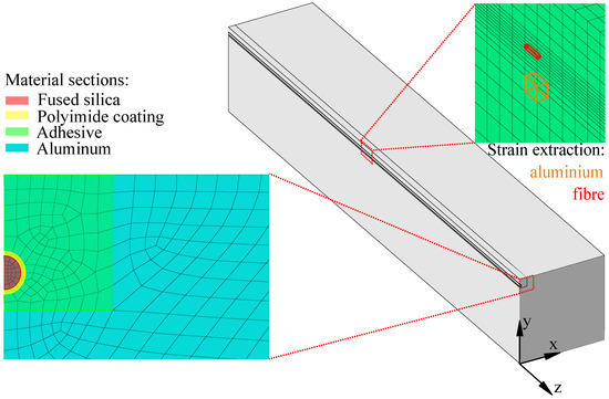 To verify that the strain of the aluminium was well transferred to the fibre, a detailed 3D FEM simulation was performed in Abaqus 2020. In the simulation, the fibre (fused silica), the polyimide coating, the epoxy adhesive EP-50-5150, and the Aluminium 6060 were resolved in detail (see Figure 6) by C3D8R linear brick elements with reduced integration. The specimen was subjected to a temperature profile of a warm-up from LN2 to room temperature in several steps (77 K, 100 K, 200 K, and 300 K) with reference at 294.95 K. The procedure was derived from the warm-up tests described in Section 2.5.