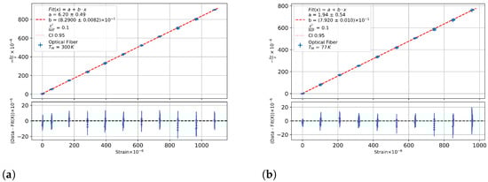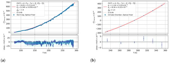 The parameters from the two adjustments are given in Table 5. The systematic uncertainty of the adjustment was determined by a joint random variation of strain, temperature, and strain sensitivity within their systematic uncertainty. An additional systematic uncertainty was related to the choice of reference temperature, which is denoted as in Equation (14). Checking the fit parameters for a dependence also gives an indication of whether the assumed theory is correct, as it does not allow for such a dependence. The results showed no significant dependence, and the scattering of the temperature sensitivity parameters for both temperature ranges was smaller than the statistical uncertainty from the adjustments in Figure 8, which were thus considered as a systematic uncertainty that was included into the overall uncertainty.