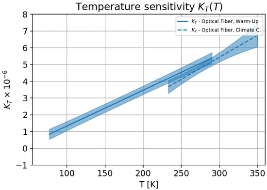 The temperature sensitivity determined here was dependent on the strain sensitivity, which was also true for all other temperature sensitivities reported in the literature. A comparison was, therefore, difficult, since, in the literature, a constant strain sensitivity has been assumed for the determination of the temperature sensitivity. Figure 9 shows the measured temperature dependence.