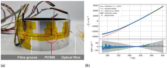 The optical fibre was glued into a groove with dimensions of mm in width and mm in depth at half the height of the cylinder. The fibre was fed in and out of the ring through mm long PEEK tubes with an offset to each other. Six Pt1000 sensors were attached to the structure, and the same warm-up and climate chamber measurements were performed as were performed for the temperature sensitivity calibration. For the calibration test, a reference measurement between K and K was used at K to show a possible reference temperature bias. An average of mm with the IQR filter was used at the position of the second Pt1000 sensor, as shown in Figure 10a. By using the measured temperature and the calculated strain data, a prediction was made with Equation (12).