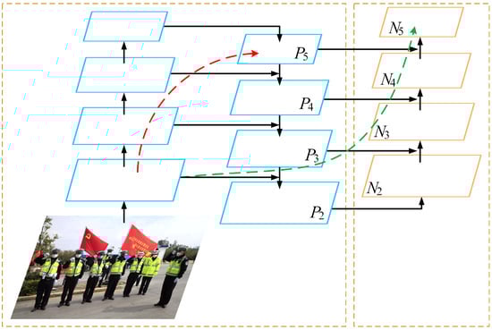 As shown in Figure 2, PANet is a further improvement of FPN, which increases the multi-path weighted aggregation layer, so that the model can obtain multi-scale semantic characteristics of different layers on a weight, thereby bringing the accuracy and stability of the detection. At the same time, PANet uses path aggregation modules to enhance the ability of the network, and enhances the characteristics of other layers according to the characteristics of different layers, so as to achieve stronger feature aggregation. The AP50 of PAnet on Mask R-CNN [] is 4.9% higher than FPN.