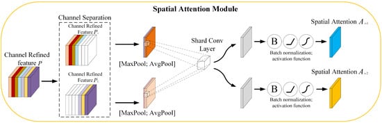 In the spatial attention module, the channel separation operation divides the channel refinement features into two groups along the channel axis. A hyperparameter that controls the separation rate is the boundary between important and sub important channel groups. This hyperparameter is multiplied by the channel dimension of the channel refinement feature to obtain the dimension of the important channel features. The spatial attention sub-module is shown in Figure 4.