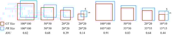 As shown in Figure 5, the red box represents the real box, and the blue box represents the prediction box. Given a fixed offset of 5 for the regression parameter, the smaller the object size, the smaller the IoU. Therefore, positioning accuracy requires that small objects be more stringent than general objects. To meet the detection of small objects such as masks, we propose a new bounding box regression loss function to improve the accuracy of prediction box in face and mask wearing detection tasks from the perspective of fusing more information about box.