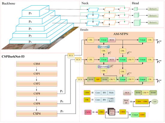 Although the feature pyramid improves the use of shallow information by fusing different levels of feature maps, it loses some object information during the convolution and pooling processes of fusion. In particular, the following sampling operations, which produce low-resolution feature maps, lose most of the fine feature information. To alleviate this problem, we added cross stage lateral connections to the feature pyramid inspired by residual networks. It will make up for some of the missing object information. In addition, a lightweight hybrid attention HAMNet was added to the feature pyramid lateral fusion path to dig deeper into the feature information of feature maps at different scales. This highlights the object information in order to retain more of it during convolution and pooling, etc. Applying these two methods on the basis of the feature pyramid obtained a novel feature pyramid network based on the attention module(AM-NFPN). Its framework diagram and details are shown in the neck section in Figure 9.