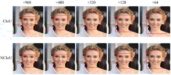 Figure 10 shows test images with pixel values from 64 to 960, and applied CIoU and NCIoU functions on the image pyramid. The object in the test image is a face. The results show that the lower the pixel value, the more difficult the loss function is to process the object. As discussed in Section 3.1, rich bounding box information can provide more accurate prediction boxes to help detect more objects, accompanied by higher confidence. In addition, additional box information does not only make the prediction box closer to the real box, but also adjust the aspect ratio of the bounding box to obtain a higher intersection ratio to make the detection effect more accurate, which is fully demonstrated in the test diagram. It is worth noting that NCIoU can still provide a more reasonable prediction box compared to CIoU in extreme situations.