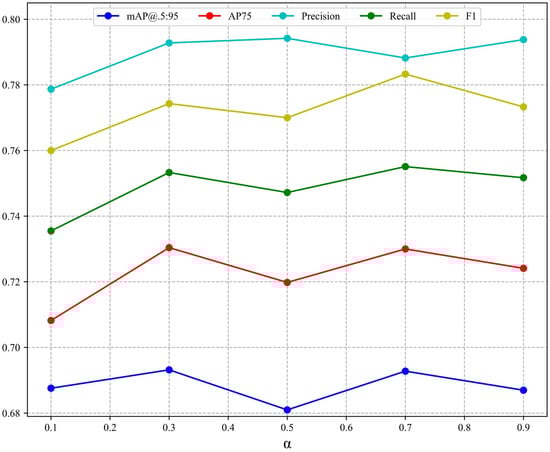 The advantage of NCIoU is that the parameters can be adjusted to adapt the function to changing detection scenarios, and varying allow the function to obtain different characteristics to cope with complex scenarios. The variation of each index of NCIoU for different values of is shown in Figure 11. There are five groups of experiments with values of 0.1, 0.3, 0.5, 0.7, and 0.9. It can be seen from the figure that each metric has good improvement when is 0.3 and 0.7, but the F1 score decreases abruptly when is 0.7. Overall, the model performance is optimal when is 0.3. When is 0.5, the model has the least improvement effect, but the performance of NICIoU is also better than CIoU at this time.