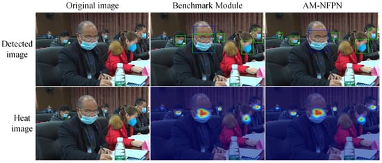 After AM-NFPN compensates and highlights the object information, the feature map can obtain enough information for even smaller objects to make the model identify the presence of an object and thus improve the detection accuracy. In addition, since there are common attributes and features for the three categories of face, normative mask wear and irregular mask wear, a mask can be used to describe whether or not the mask is normatively worn in both cases when the mask wear is between or close to the defining line of the two categories, it is easy to cause the model to return two different categories of prediction boxes for the same object. This situation is especially prominent when the information is not sufficient. The benchmark module lacks sufficient detailed information to predict the irregular category as both normative and irregular mask wear, while the ability to incorporate more target information AM-NFPN greatly avoids this situation and reduces the false detection rate.