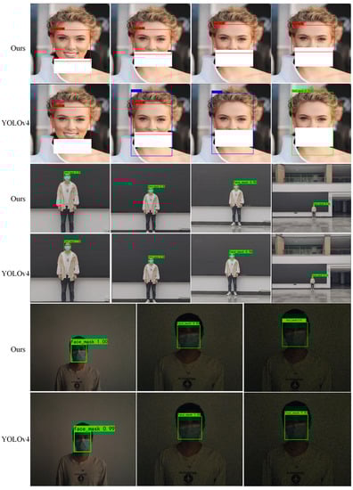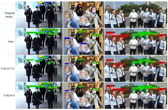 We selected YOLOv4 and YOLOv7-X, which have better algorithm performance, and did the visualization and analysis of the detection results of each algorithm in the same experimental environment, as shown in Figure 13. The standard mask object is marked as face_mask in green, followed by the number of confidence degrees; the irregular mask-wearing object is marked as WMI in blue; the face object is marked as face in red.