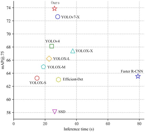 Measuring the superiority of an algorithm mainly requires not only considering the detection accuracy of the algorithm, but also weighing the detection speed. For detecting faces and masks in public places, an algorithm with excellent accuracy and speed is needed; high accuracy and low speed or vice versa will not accomplish the desired task. For this purpose, the accuracy and speed of several algorithms are shown in Figure 15. It shows that the detection accuracy of our algorithm is the most competitive. Although the detection speed is not the fastest, it is only less than two milliseconds compared to the YOLOv4 algorithm, which has achieved a high balance of accuracy and speed and is widely used, and slightly better than YOLOv7-X in terms of speed and accuracy. The YOLOX algorithm increases the detection speed as it reduces the complexity of its backbone feature extraction network, but the accuracy rate decreases and it is difficult to complete the detection task. YOLOX-X algorithm has good speed and accuracy, but it still has some gap from our algorithm. Other algorithms such as SSD and EfficientDet can meet the requirements in terms of detection speed but still have a certain gap in accuracy. Overall, our algorithm is a balanced algorithm in terms of detection accuracy and degree and can meet the requirement of detecting faces and masks in real time.