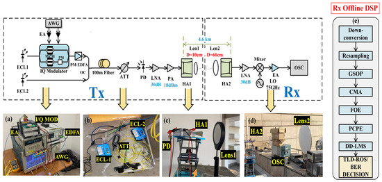 The ROF experimental setup for W-band PS-16QAM RoF delivery over 4.6 km and photos of (a) the I/Q modulator, EA, PM-EDFA, and AWG; (b) ECLs and the ATT; (c) the PD, HA, and lens at the Tx-side; (d) the PD, HA, and lens at the Rx-side; (e) the block diagram of Rx DSP.