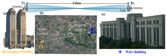 Figure 4 shows the photos of the long-distance radio-over-fiber delivery of the PS-16QAM signal over 4.6 km on Fudan campus. The Tx-side of the W-band 4.6 km wireless transmission system was situated at the Guanghua Building on the Handan Campus of Fudan University, and the Rx-side was located at the WuLi Building on the Jiangwan Campus of Fudan University. The distance between them was 4.6km on the satellite map. At the receiver, the received signal by HA was firstly boosted by a low-noise amplifier (LNA) with a 30 dB gain, and then down-converted into a 13.5 GHz intermediate frequency (IF) signal via a commercial mixer driven by a radio frequency (RF) signal with a frequency of 75 GHz. Additionally, the amplified IF signal after an EA with a gain of 26 dB was finally captured by a digital storage oscilloscope with a sampling rate of 100 GSa/s and an electrical bandwidth of 45 GHz. As shown in Figure 4, the offline DSP at the Rx-side is followed by down-conversion, resampling, the Gram–Schmidt orthogonalization procedure (GSOP), constant modulus algorithm (CMA), frequency offset estimation (FOE), carrier phase estimation (CPE), decision-directed–least mean squares (DD-LMS), and nonlinear equalization. Here, the nonlinear equalization methods which we compared include typical Volterra series, TLD, and TLD equalizers combined with ROS (TLD-ROS).