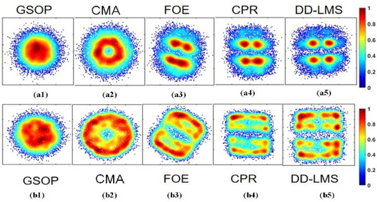The density distribution of PS-16QAM constellation diagrams after (a1) GSOP; (a2) CMA; (a3) FOE; (a4) CPR; and (a5) DD-LMS, and the density distribution of 16QAM constellation diagrams after (b1) GSOP; (b2) CMA; (b3) FOE; (b4) CPR; and (b5) DD-LMS.